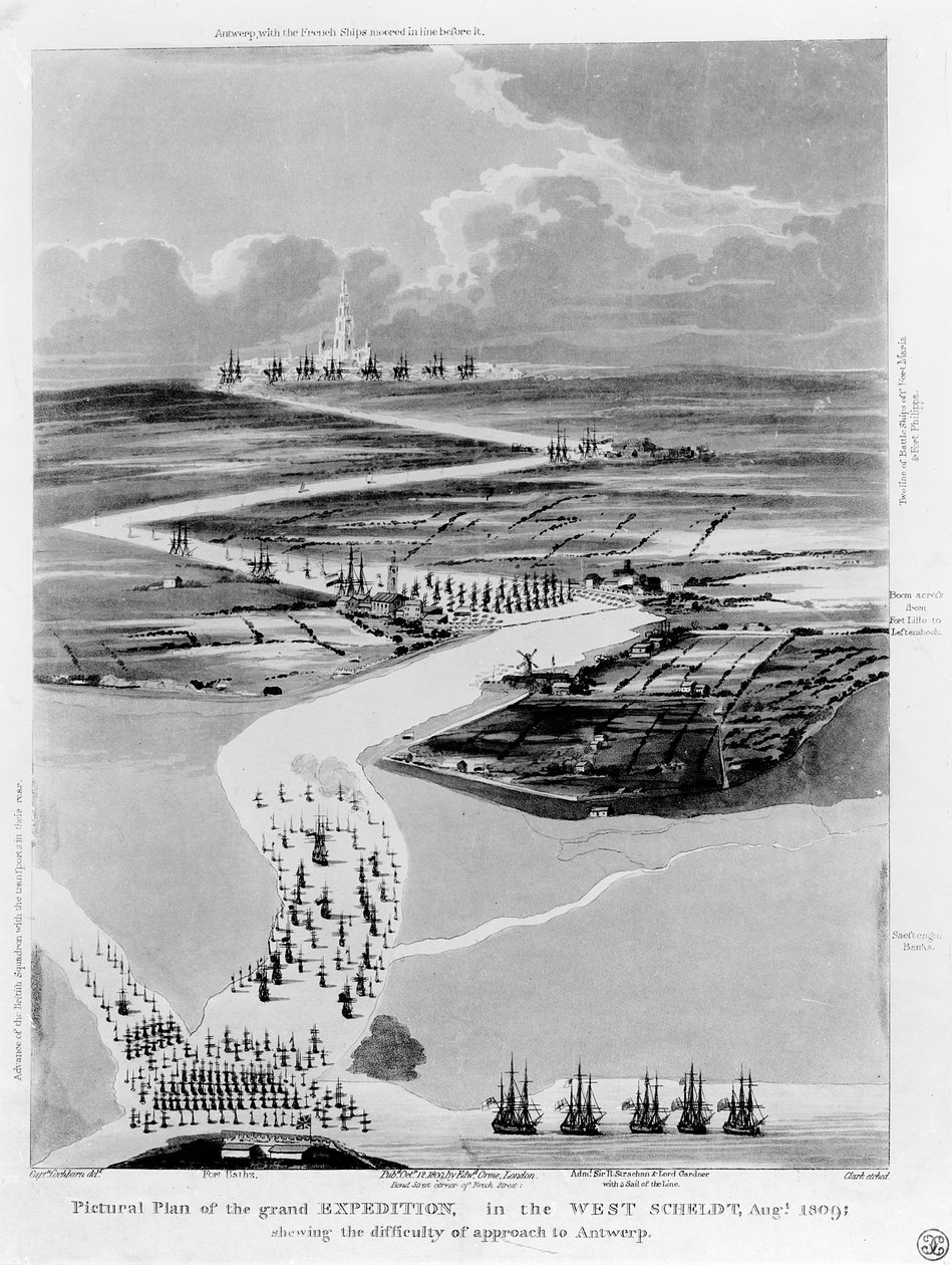 A Nyugat-Scheldti Nagy Expedíció képi terve, 1809. augusztus, Antwerpen megközelítésének nehézségeit mutatja, Clark metszet(Pictural Plan of the Grand Expedition in the West Scheldt, August 1809, Showing the Difficulty of Approach to Antwerp, etched by Clark )Captain Cockburn |