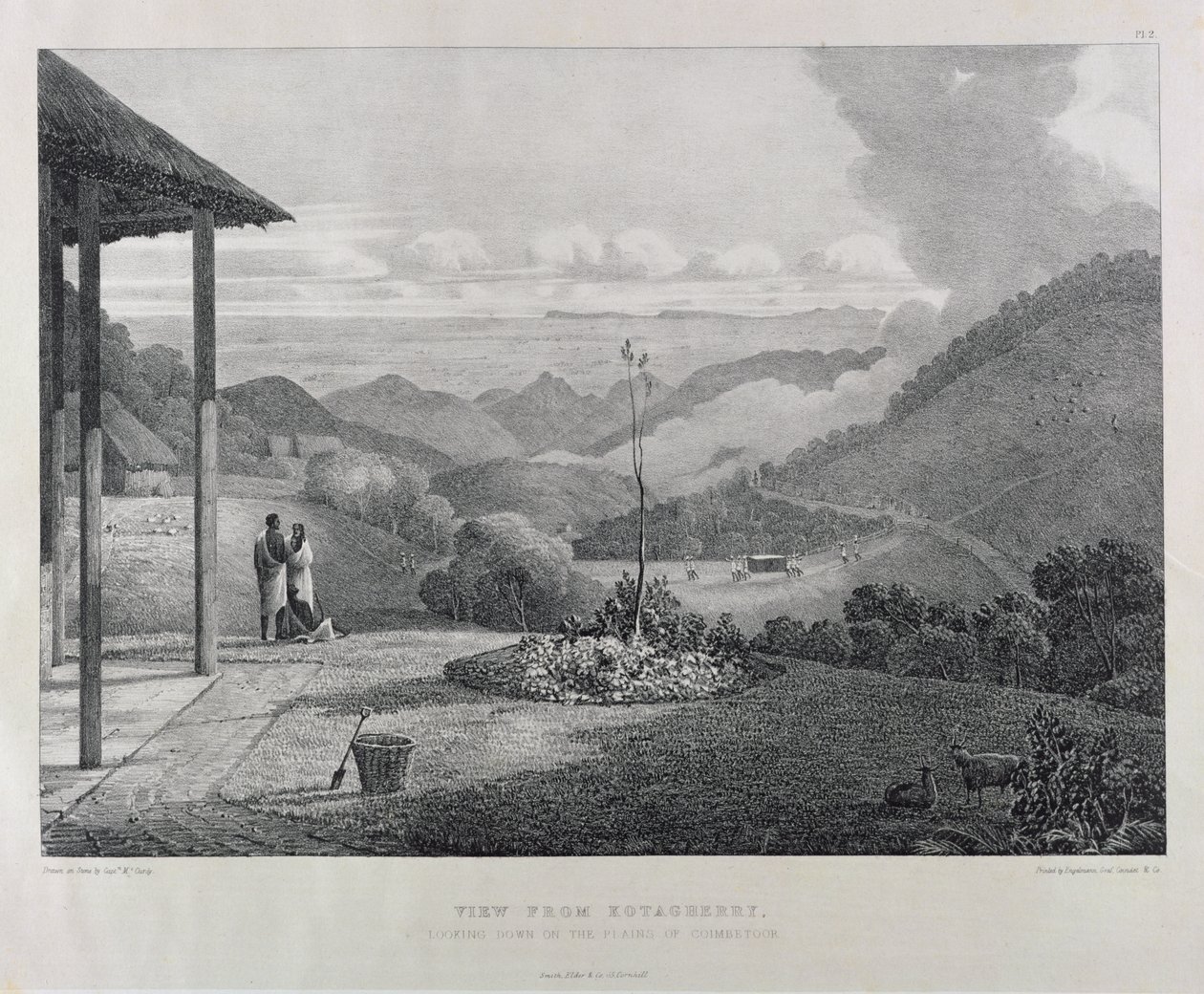 Kilátás a Kotagherryről Lenéz a Coimbetoor-síkságon, 2. tábla McCurdy kapitány „Nézze meg a Neilgherries-t vagy a Coimbetoor kék-hegységét, Dél-India” című művéből, 1830-ban.(View from Kotagherry Looking Down the Plains of Coimbetoor, plate 2 from 'View of the Neilgherries, or Blue Mountains of Coimbetoor, Southern India' by Captain McCurdy, published 1830 )Captain E. A. McCurdy |