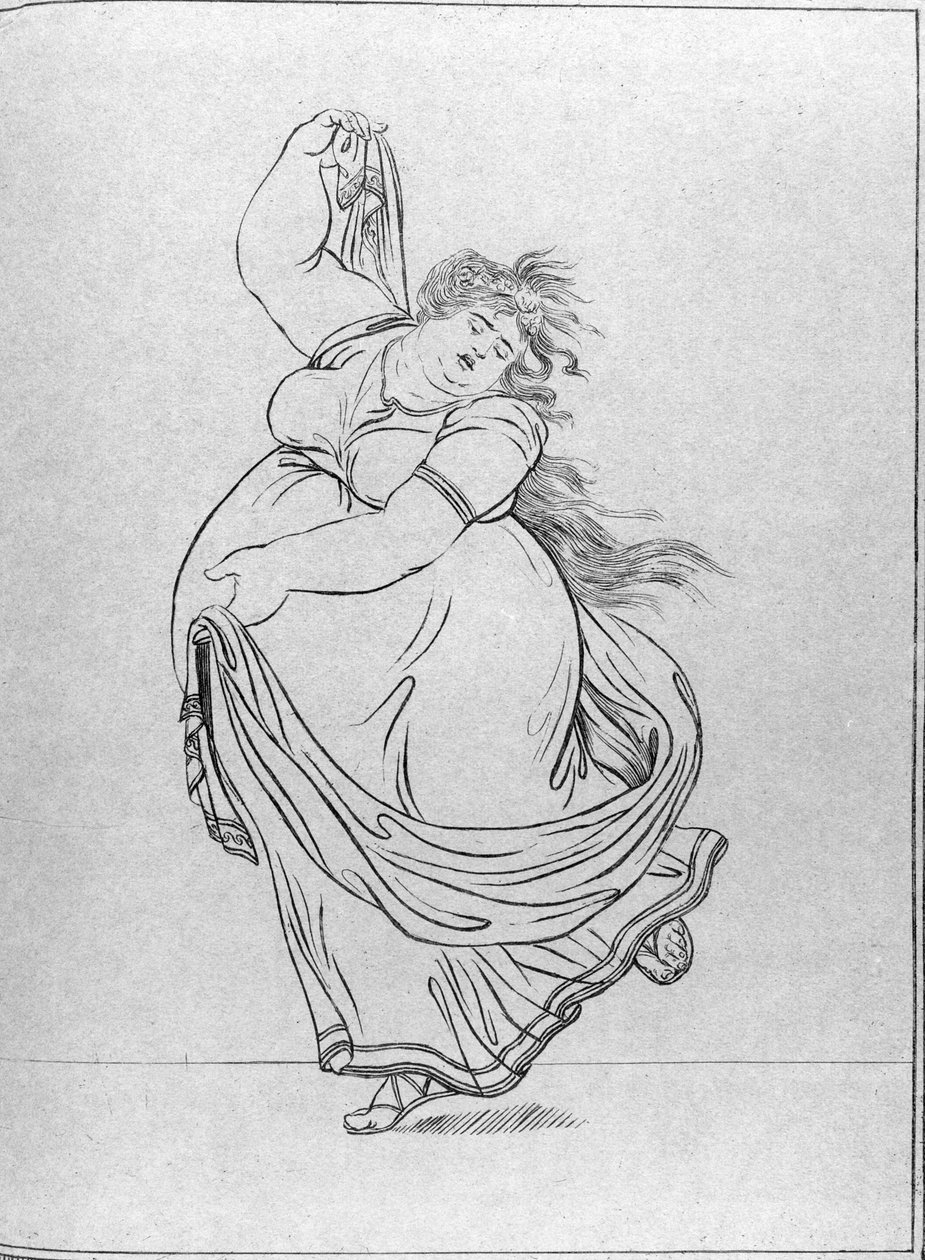 A Táncmúzsa, VI. tábla Lady Hamilton „Attitudes” című művének új kiadásából, jelentősen kibővítve, James Gillray-nek (1757-1815) tulajdonítva, Hannah Humphrey 1807-ben (kék papírra vésve)(The Muse of Dance, Plate VI from a new edition considerably enlarged, of Lady Hamilton's 'Attitudes', attributed to James Gillray (1757-1815) published by Hannah Humphrey, 1807 (etching on blue paper))Frederich Rehberg |